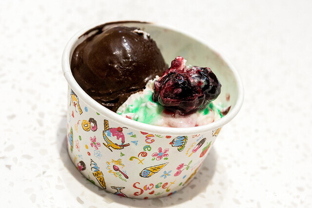 Стоимость мороженого, как и везде, зависит от размера порции: шарик весом в 70 граммов вам обойдется в 25 000 рублей, два шарика — 45 000 рублей, три — 65 000. За шарик весом в 112 граммов нужно будет заплатить 40 000 рублей, за два — 70 000, за три — 100 000.