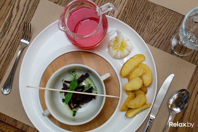 Подается блюдо также в отдельных емкостях. В тарелке официант приносит нарезанный свежий огурец и свеклу, запеченную в фольге. В кувшине — эдакая свекольная «вытяжка», которая получается в результате настаивания залитой водой свеклы с добавлением специй и уксуса.