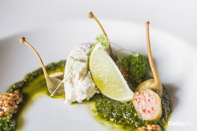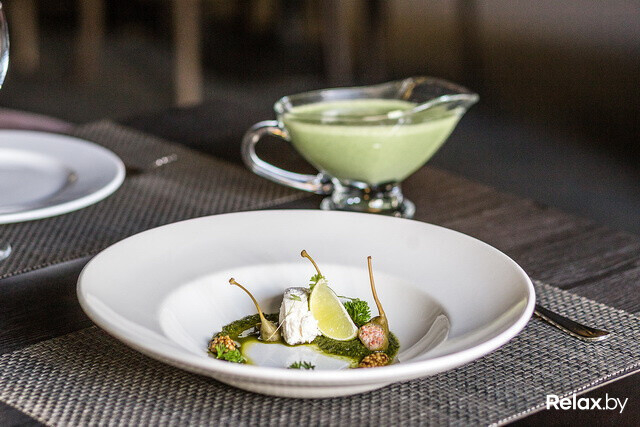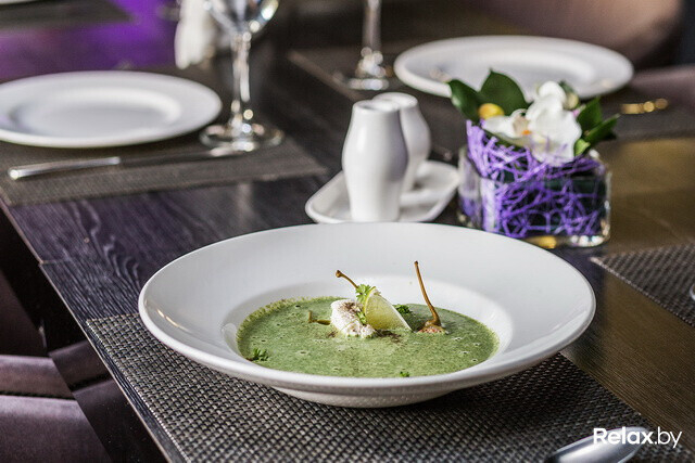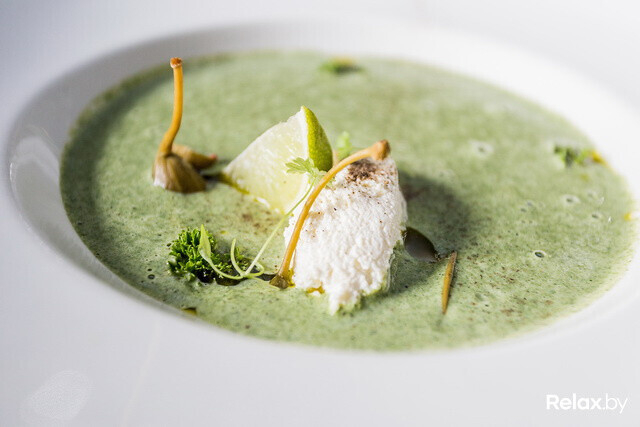 Подают блюдо все тем же модным сейчас способом, то есть раздельно. В качестве гарнировки к супу идут французская горчица, сыр рикотта, соус песто, зелень и долька лайма. В отдельном кувшинчике приносят сам суп из крапивы, мяты, глазированного в белом вине лука и сливок.