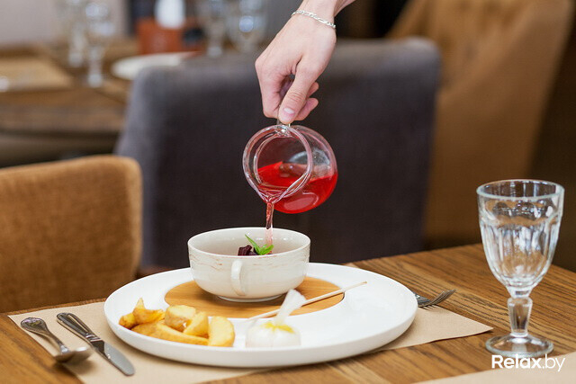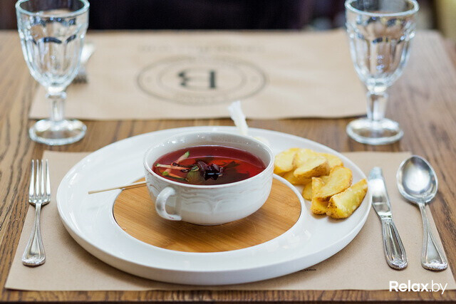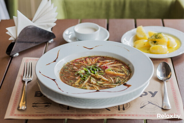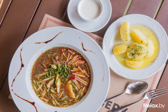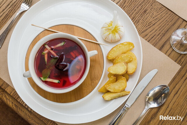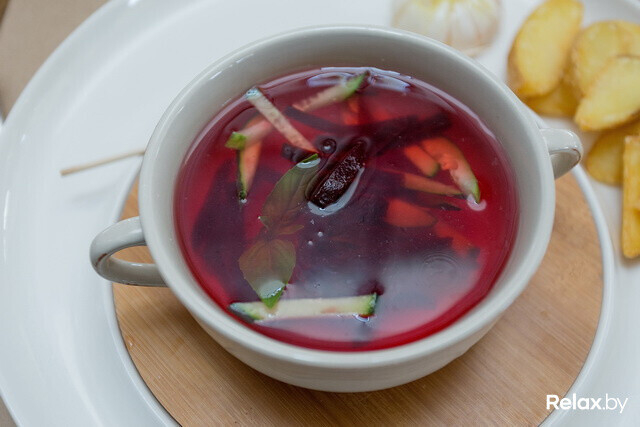 Необычный вариант свекольного холодника также найдете в ресторане — там его подают не только с традиционной жареной картошкой, но и с «пьяным» яйцом.