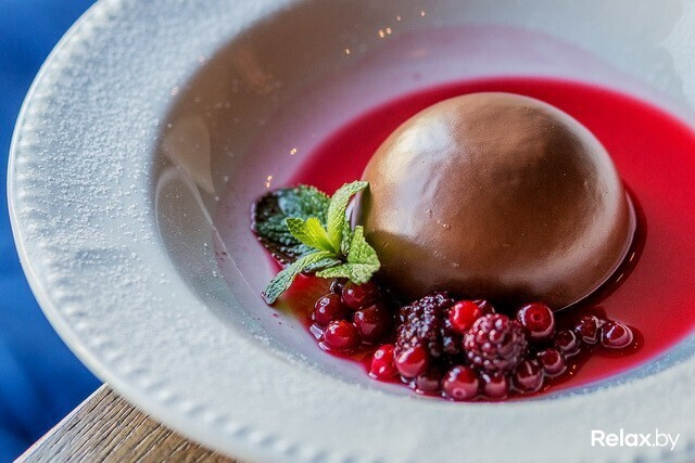 Десерты в форме сферы — модное направление в кондитерском искусстве последних лет. Может показаться, что блюдо выглядит простым, но его приготовление является одним из самых технически сложных. Впрочем, достаточно попробовать его, чтобы понять: усилия того стоят! Блюдо создано из белого и черного шоколада. Сперва делается мусс из белого шоколада, в который добавляются молоко и желтки. Масса взбивается с сахаром, а потом доводится до готовности на водяной бане. Затем добавляются сливки и первоначальная форма замораживается в шок-машине. Дальше делается шоколадная начинка на основе какао, а параллельно вторая часть блюда из черного шоколада. Готовые слои объединяются и заливаются нежным шоколадным ганашем. Подается десерт с соусом из ежевики, клюквы и малины.