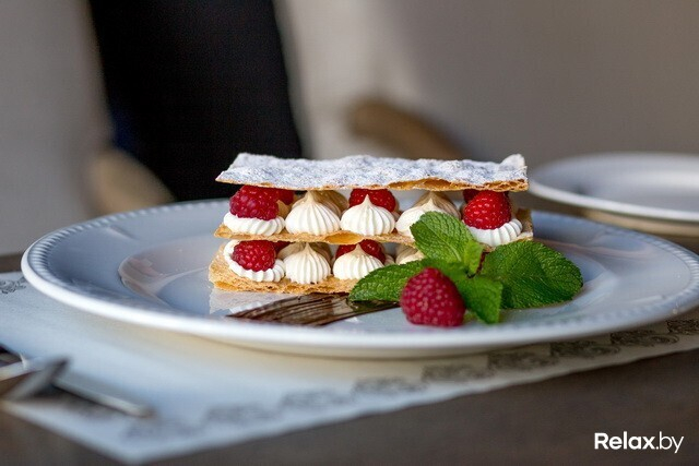 Одни полагают, что мильфей — традиционное французское блюдо. Итальянцы же считают его исконно своим. Но если вчитаться в название, то можно перевести его с французского как «тысяча листочков». Такое название возникло из-за слоеного теста, а также принципа многослойной «сборки» десерта. Тесто раскатывается, посыпается сахарной пудрой и тут же, как говорится, «идет в работу». Максимальная свежесть — самый важный компонент. А все для того, чтобы гость ощутил приятный хруст десерта. Также в составе блюда — классический заварной крем, дополненный веточкой ванили и сливками. Украшенный мятой, мильфей подается со свежей малиной.