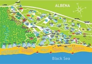 Для кого: этот курорт подходит и для семейного отдыха, но в большей степени мы бы посоветовали его молодежи. Сейчас здесь работает около сорока гостиниц разного уровня. Албена очень зеленый курорт: где бы вы ни были, вас окружат зеленые парки и цветущие клумбы. Найдут себя здесь и любители дискотек, ресторанов, кафе. Есть все услуги для любителей активных видов спорта (в том числе и водных).