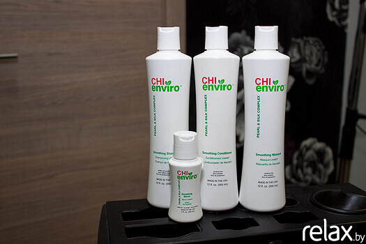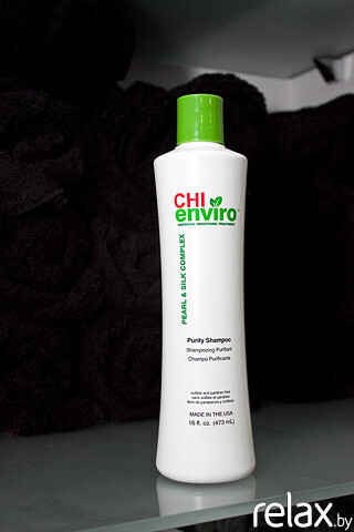 «После CHI Enviro можно использовать любой шампунь без сульфатов. Но мы рекомендуем применять специально разработанную серию уходов. Все средства CHI Enviro содержат жемчужный и шелковый комплексы, обеспечивают максимальное питание, увлажнение и разглаживание непослушных и кудрявых волос. Волосы предохраняются от спутанности, остаются мягкими, послушными и невероятно блестящими».