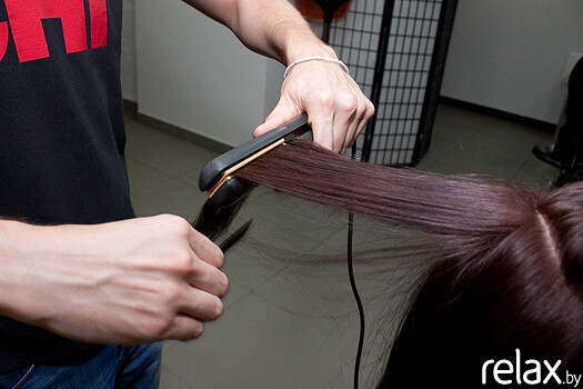 Затем Евгений начинает обработку затылочной области, тщательно проглаживая каждую прядь волос профессиональным утюгом для волос CHI c плавающими керамическими пластинами и цифровым процессором. Тепло проникает внутрь волоса и способствует закреплению состава.