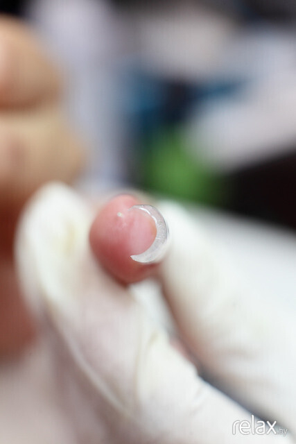 Первый этап — это подготовка ногтя. Мастер обрабатывает ногти дезинфектором.
