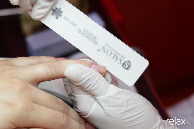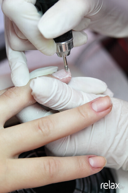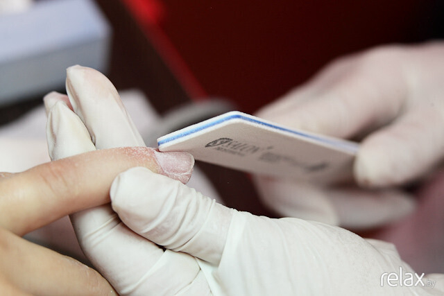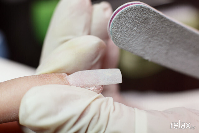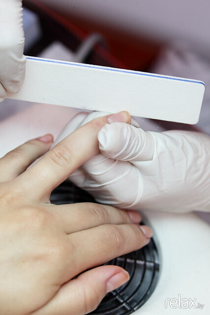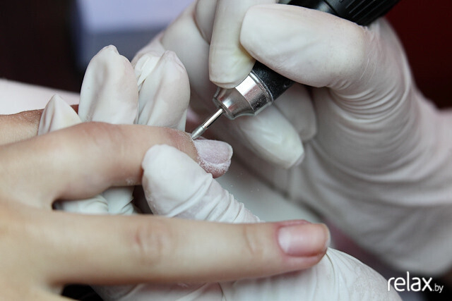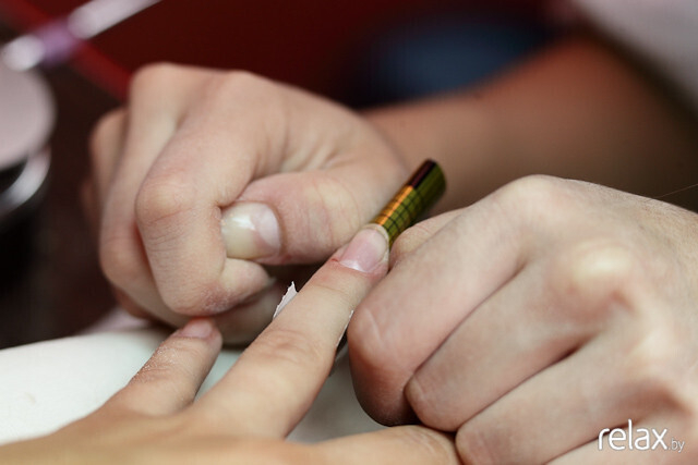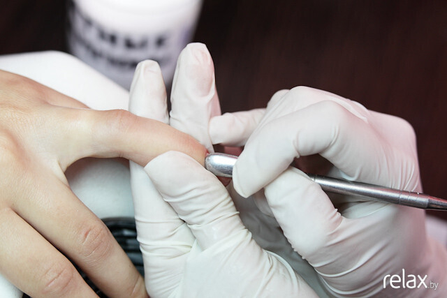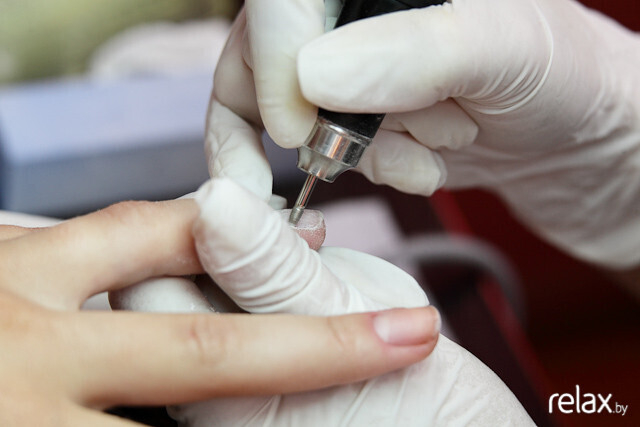 Результат закрепляется машинкой: Анастасия убирает остатки кутикулы.