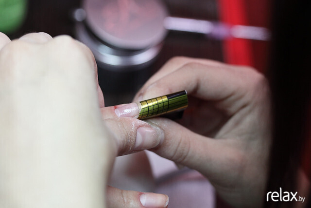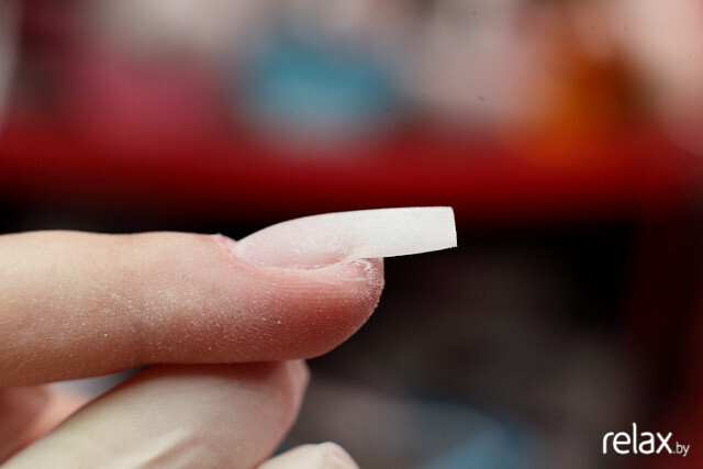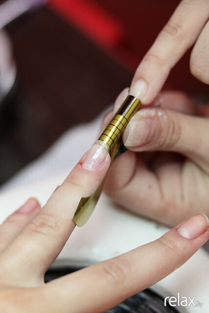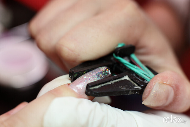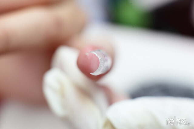 Анастасия вновь использует зажим для придания формы искусственному ногтю. С-изгиб приобретает завершенность.
