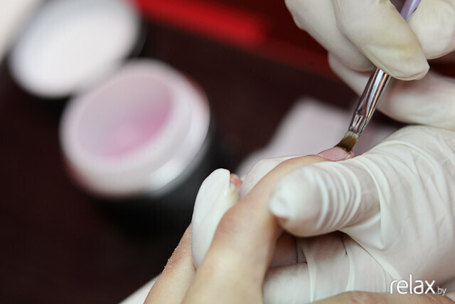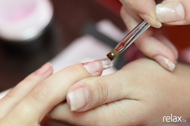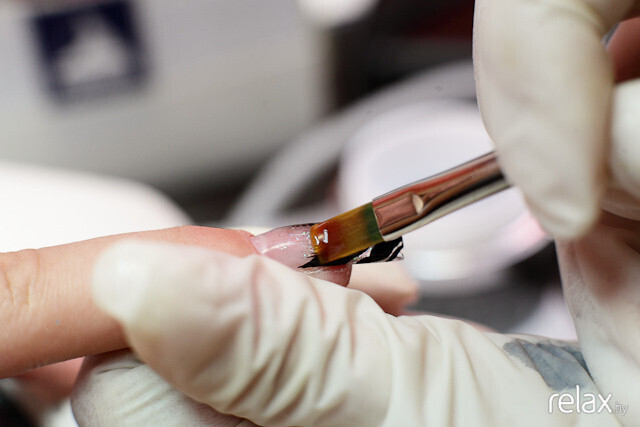Подготовка ногтя завершена. Второй этап процедуры — нанесение геля. Втирающими движениями Анастасия при помощи кисточки наносит тонкий слой геля, не подбираясь близко к кутикуле.