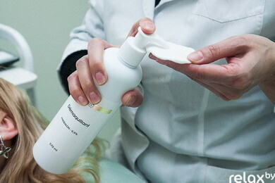 Итак, первый этап процедуры — бережное очищение кожи с помощью специального средства от остатков макияжа, уличной пыли, ороговевших клеток. Косметолог использует профессиональное средство французского косметического бренда «Kosmoteros».