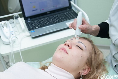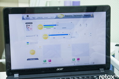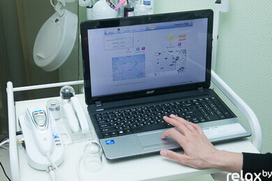 Далее косметолог измеряет степень влажности различных участков кожи (лица, шеи и декольте) с помощью специальных датчиков. Измерение производится в точках двух выбранных зон. Компьютерная программа сравнивает полученную информацию с нормальными для определенного возраста показателями. Итоговая цифра вводится в программу анализа. Оксана отмечает, что показатель выше 35% считается нормальным.