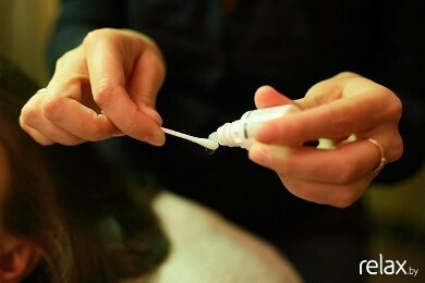 4. Спустя 20 минут компресс снимается, ватной палочкой аккуратно убирается гель и наносится жидкий фиксатор. Затем снова делается компресс и оставляется на 15 минут. Спустя время остатки фиксатора смываются и валики снимаются ватными дисками, предварительно замоченными в теплой воде.