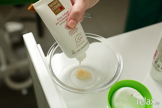 3. Кисточкой равномерно наносится эксфолиант от MARY COHR, который способствует еще более глубокому очищению и удаляет мертвые клетки. От скраба эксфолиант отличается более мягким действием.