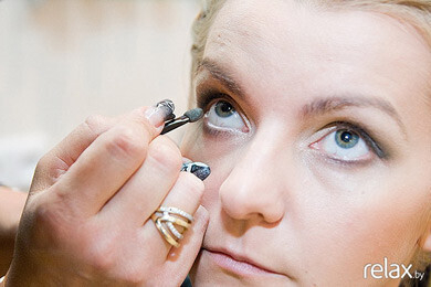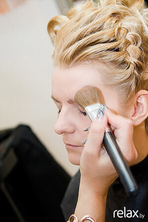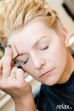 1. Тон кожи на лице и зоне декольте выравнивается с помощью основы под макияж, замазываются проблемные места, если они есть.