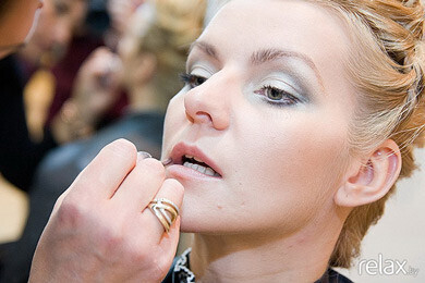 Макияж для этого образа выполняется по этой же схеме. Только здесь выделены и глаза, и губы. Для макияжа глаз использовали сочетание теней, а губы подвели контурным карандашом и нанесли на них сочный тон.
