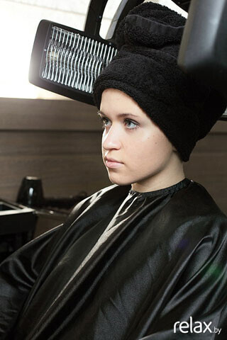 4. Наносится препарат-экранирование. Выдержать его нужно 20 минут под климазоном. Теплый воздух климазона способствует тому, что состав лучше впитывается волосом, а значит и результат будет заметнее.