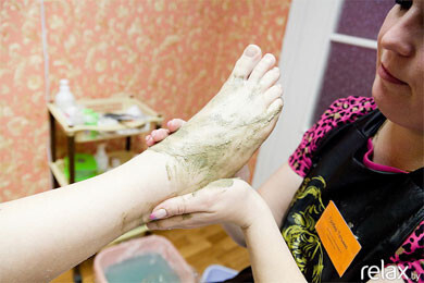12. Грязь наносится на ноги клиента. Затем ножки заворачиваются в пленку. На дно тазика кладется горячее полотенце, на него ставятся ноги и сверху их укрывают фольгой, чтобы сохранить тепло. Для максимального эффекта на фольгу кладется еще слой горячих полотенец. Грязевое обертывание обогащает кожу всеми необходимыми витаминами.