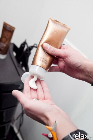 4. Теперь стилист ополаскивает волосы водой и наносит маску Brazilian Blowout, выдерживает несколько минут и смывает ее.