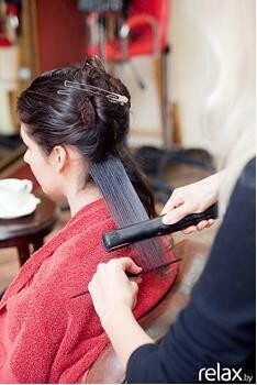 3. После нанесения средства мастер подсушивает волосы феном и, разделив их на пряди, начинает разглаживать горячим утюжком для эффективности процедуры. От корней до кончиков волос не только выпрямляется, но и получает необходимые питательные вещества.