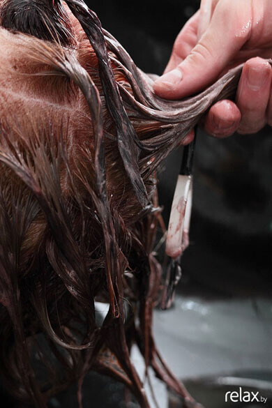 Максим пользуется краской "MATRIX" (Франция). Он выбрал общий тон “мокко” (9 уровень). Краска наносится на все волосы.