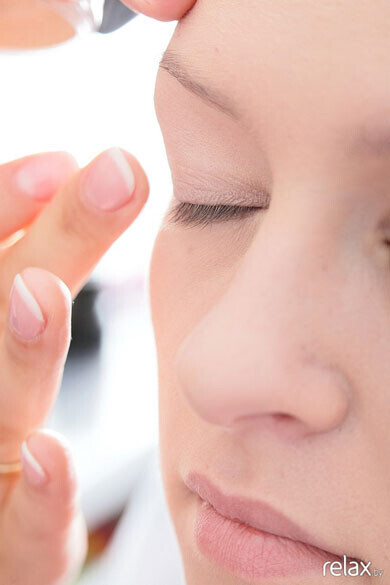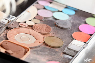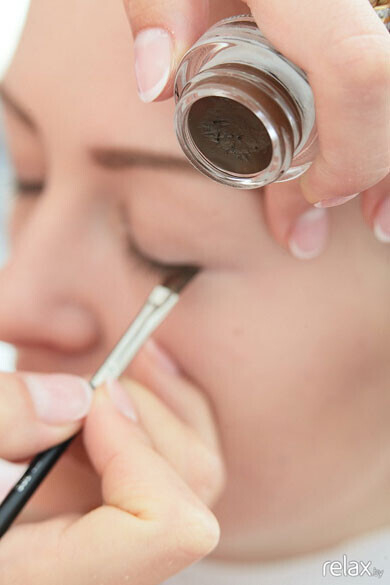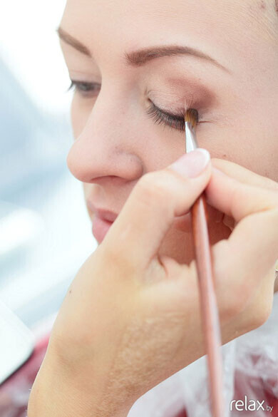 Начинаем наносить тени «MAK» (США). Высветляем уголки глаз и пространство под бровями. Двигаясь по веку, переходим к более тёмным цветам. У Даши зелёные глаза, поэтому Мария выбрала для неё коричневую гамму.