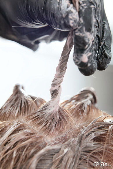 Делаем эмульгацию. Прядки блонд, которые осветлялись с помощью “ВиЛайт” — смываем и наносим на них краску уровня 5М. Оставляем на 3 минуты.