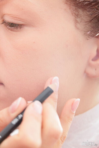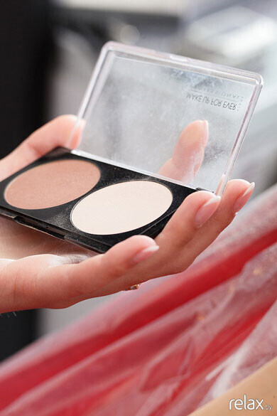 Проводим коррекцию лица — тёмным тоном подчёркиваем скулы, под глазами — высветляем.