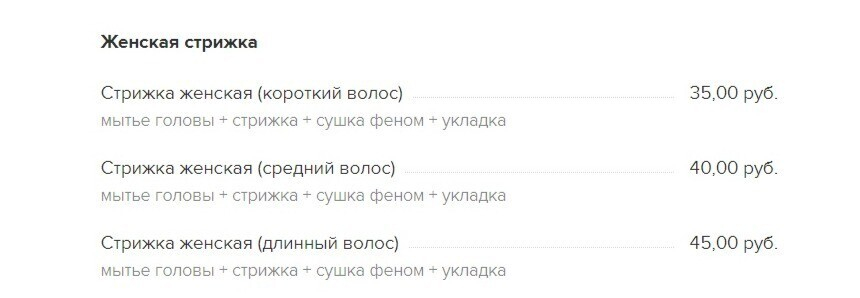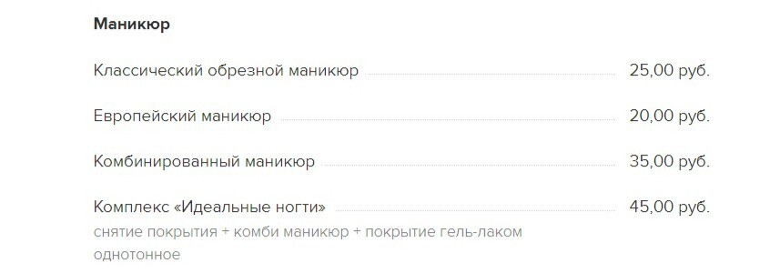 Спектр услуг действительно большой и включает в себя стрижки, уладки, маникюр, покрытие ногтей гель-лаком, моделирование и окрашивание бровей, вечерний и свадебный макияж. Так обычная стрижка для волос разной длины будет стоить от 35 до 45 рублей, маникюр — от 20, а процедуры для бровей — от 10.