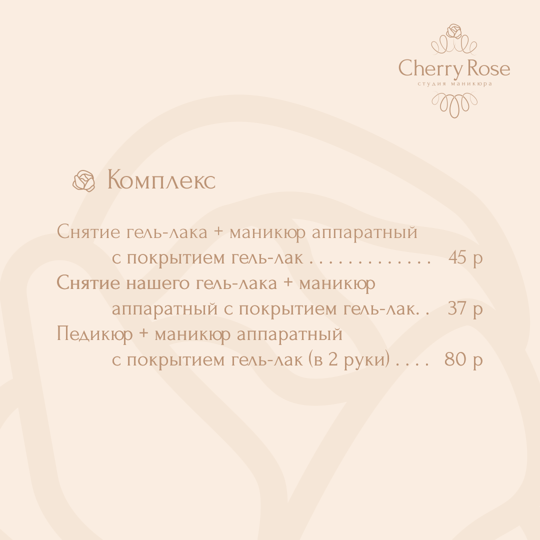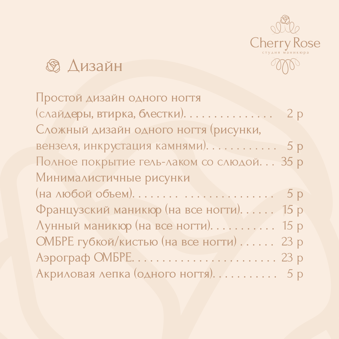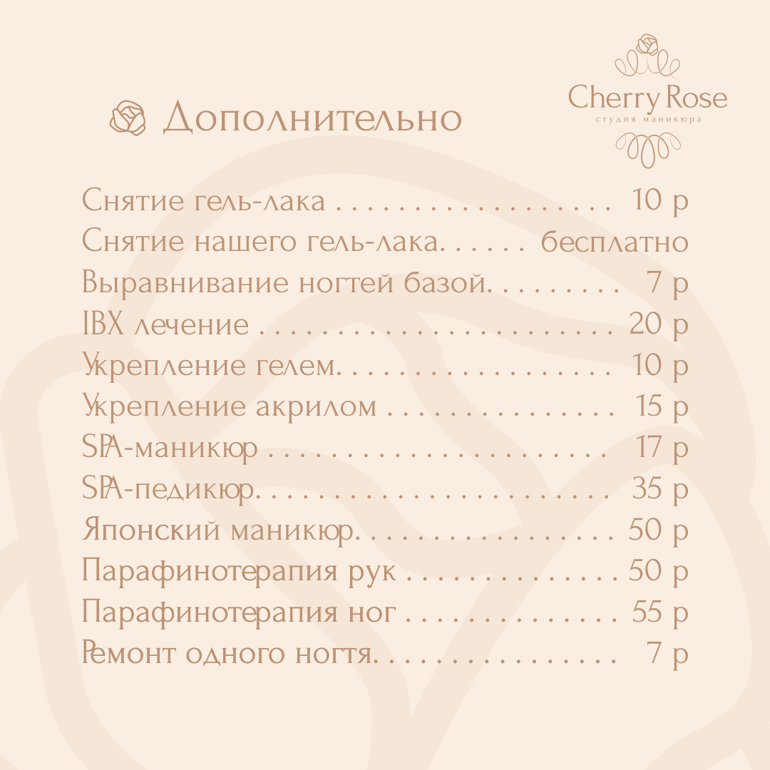 В CherryRose решили, что качество должно быть на первом месте, поэтому на работу пригласили специалистов с пятилетним стажем. Создать на ногтях красивый дизайн в зависимости от предпочтений клиента им поможет огромная гамма цветов, глиттера и слайдеров.