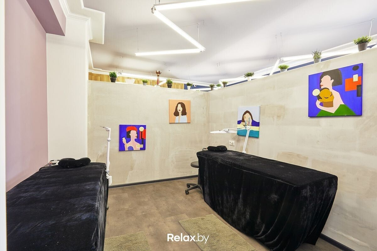 В интерьере студии преобладают пастельные тона, а на стенах развешаны яркие картины. Помещение зонировано для удобной работы специалистов и комфорта посетителей.
